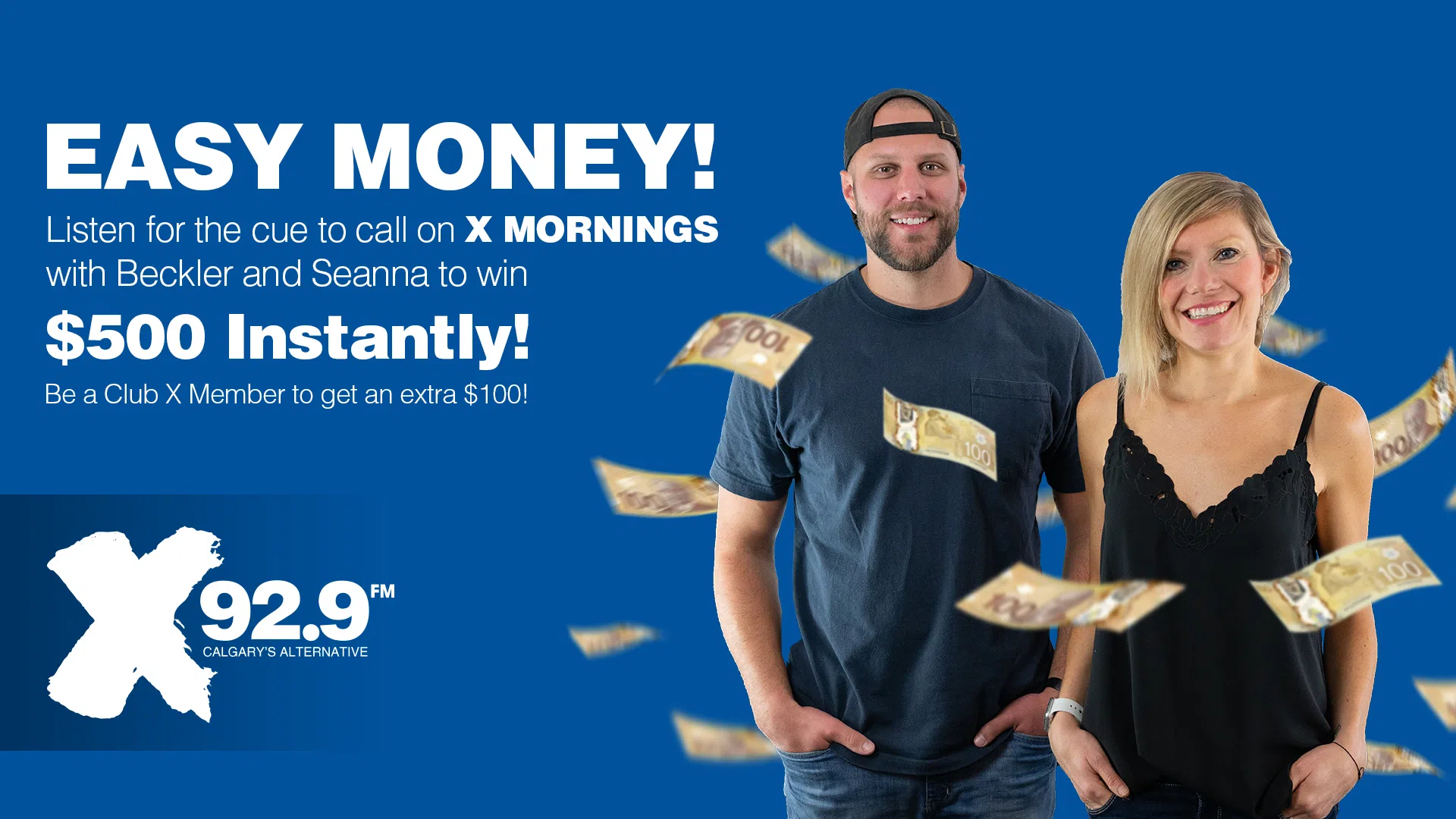 Beckler and Seanna’s Easy Money is exactly that, easy! No games, no silly sounds, no nonsense. Listen to X weekday mornings from 6–10, and when you hear the cue to call, be caller nine at 403-238-9929 to instantly win $500. And if you’re a Club X member before the cue to call, we’ll throw in an extra $100, making your win $600 total. Easy money, weekdays with Beckler and Seanna on X.